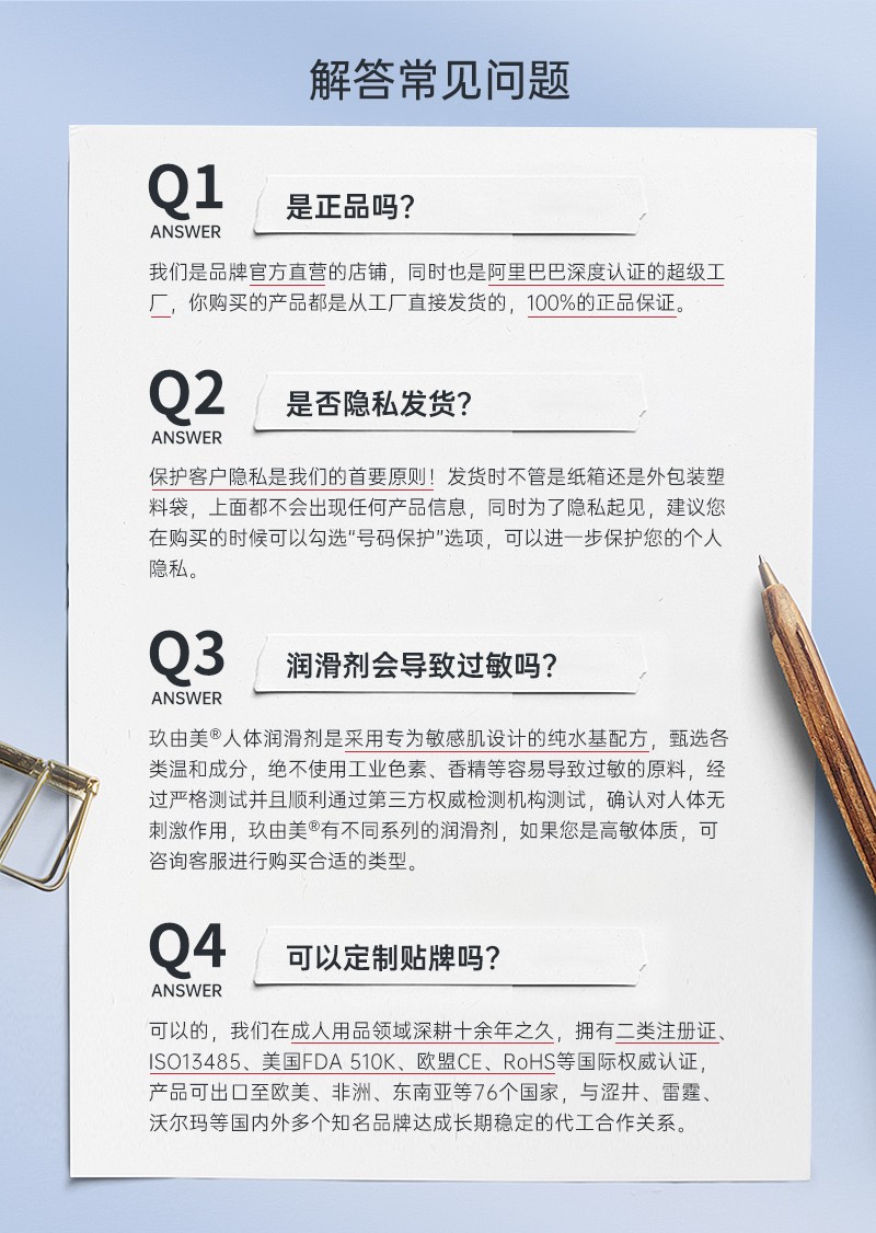 嚴(yán)格按照GMP生產(chǎn)規(guī)范!生產(chǎn)前原材料檢測(cè),確保原料合格。生產(chǎn)中半成品檢測(cè),確保生產(chǎn)過程無污染。生產(chǎn)后產(chǎn)品檢測(cè)并且出具出廠檢測(cè)報(bào)告,確保產(chǎn)品符合標(biāo)準(zhǔn),從原料到成品層層把關(guān),確保每一件均為精品。仿生體驗(yàn),與人體愛液無異